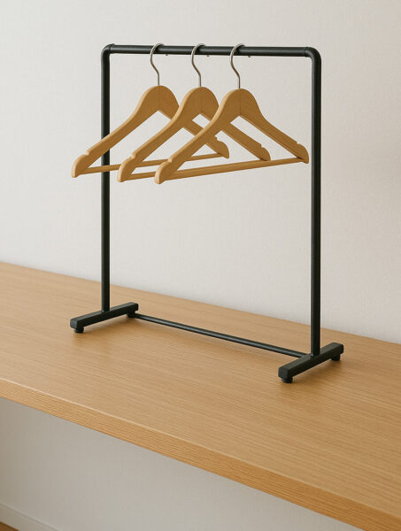 ちょっとバランスは悪いですが、机の上に小さめのハンガーラックなので