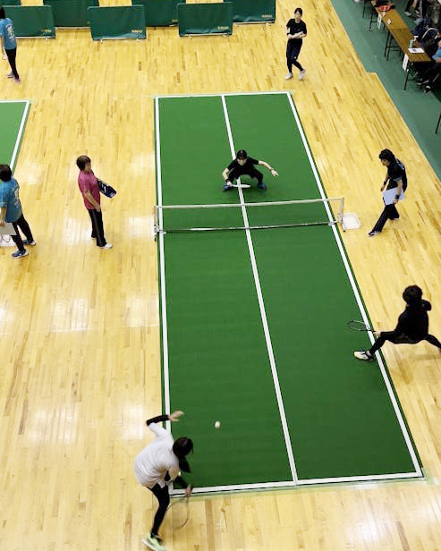 体育館の中で、3mx10mほどの芝のコートを敷いて、高さ50cmのネットを挟んでラリーします。
