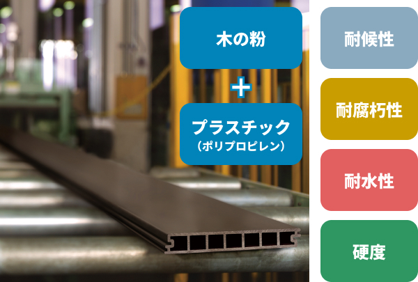 天然木に比べて強度の低下や変色が少なく、防腐のための薬品処理も不要です。