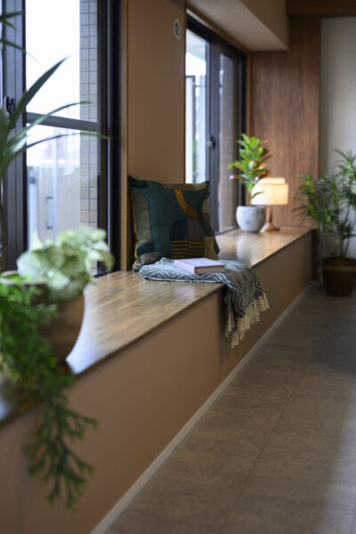 インテリアのアクセント: 壁紙の色を変えたり、一段高くしてベンチを造作したりすることで、