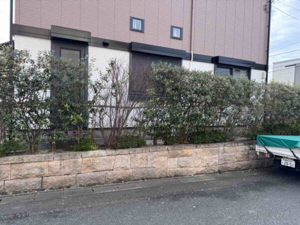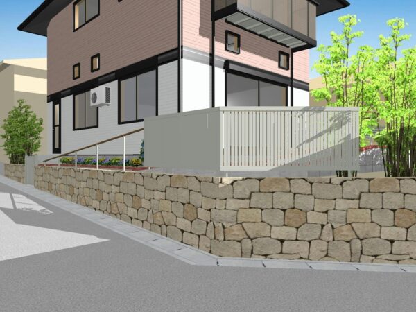 外観の確認: 既存の石積みや生垣があり、道路との高低差がはっきり分かります。