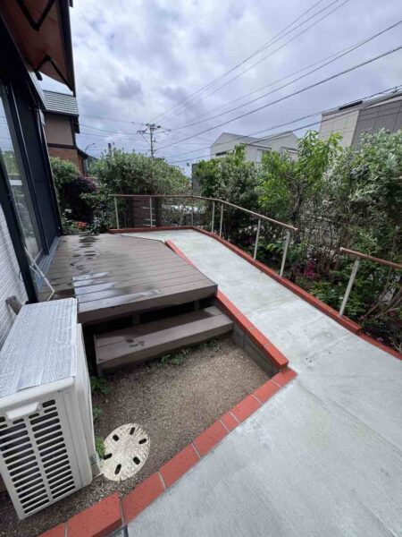 主な施工: スロープ新設(8分の1勾配)、手すり設置、植栽撤去、ウッドデッキ接続工事