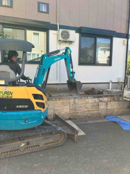 まずは、スロープの通り道を作るために生垣の撤去と土の掘削を行いました。