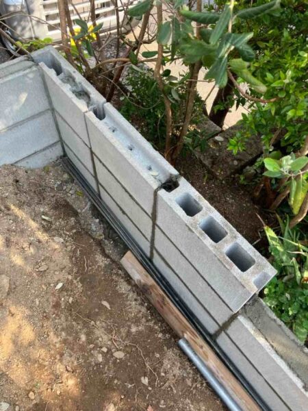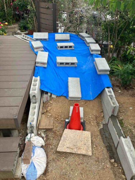 スロープの土台となる「型枠」の役割も果たすブロック基礎を積んでいきます。
