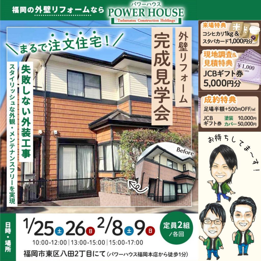 - 【日 程】1月25日(土)・26日(日) 【時 間】①10:00~12:00 / ②13:00~15:00 /③15:00~17:00 (会場:外壁リフォーム完成見学会)