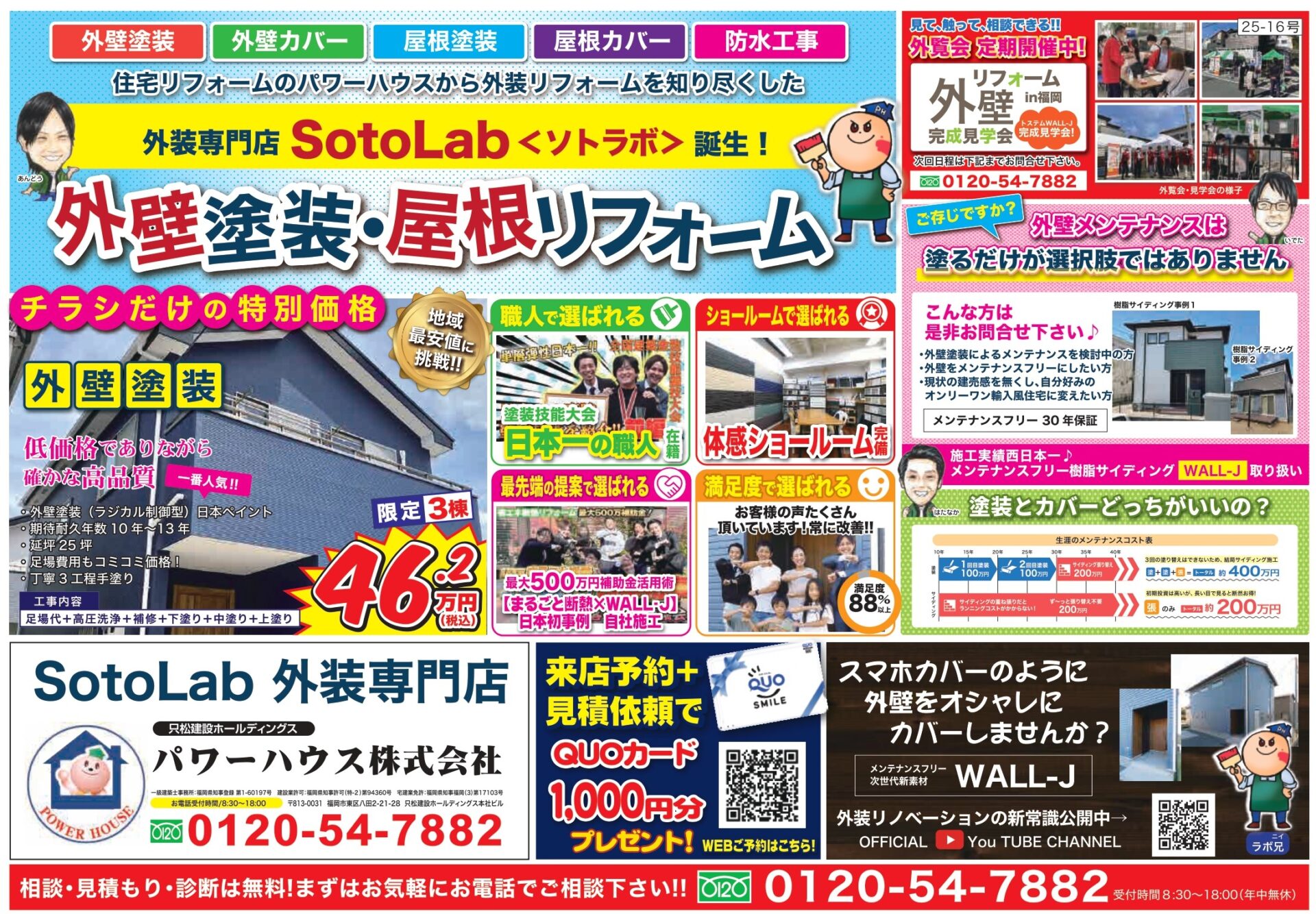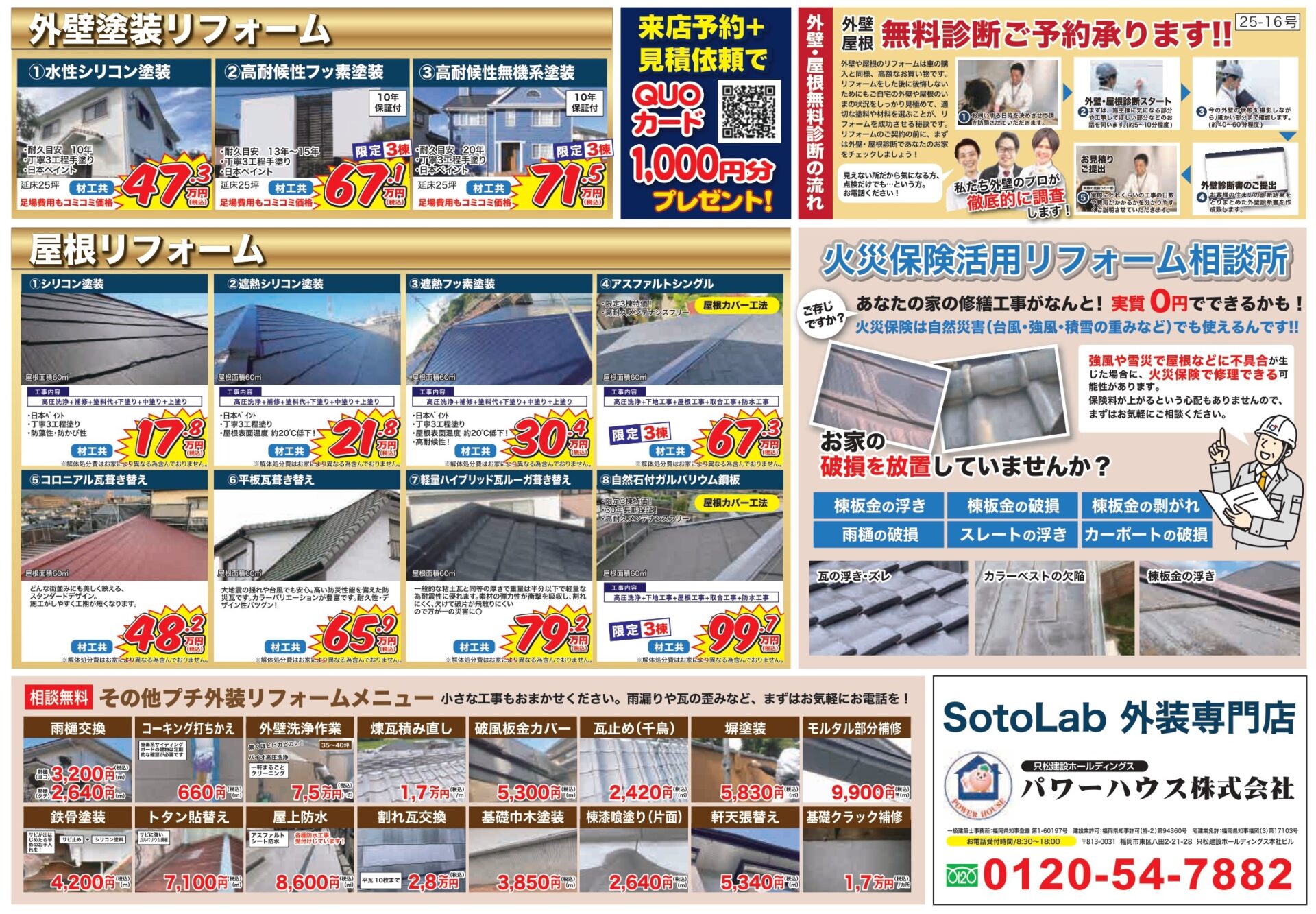 【最新チラシ】外壁&屋根リフォーム チラシをご覧になって、来店予約+見積り依頼で QUOカード1,000円分プレゼント! お電話 0120-41-5424 WEBお問合せはコチラ お気軽にお問合せください。 前の記事 次の記事 一覧へ戻る