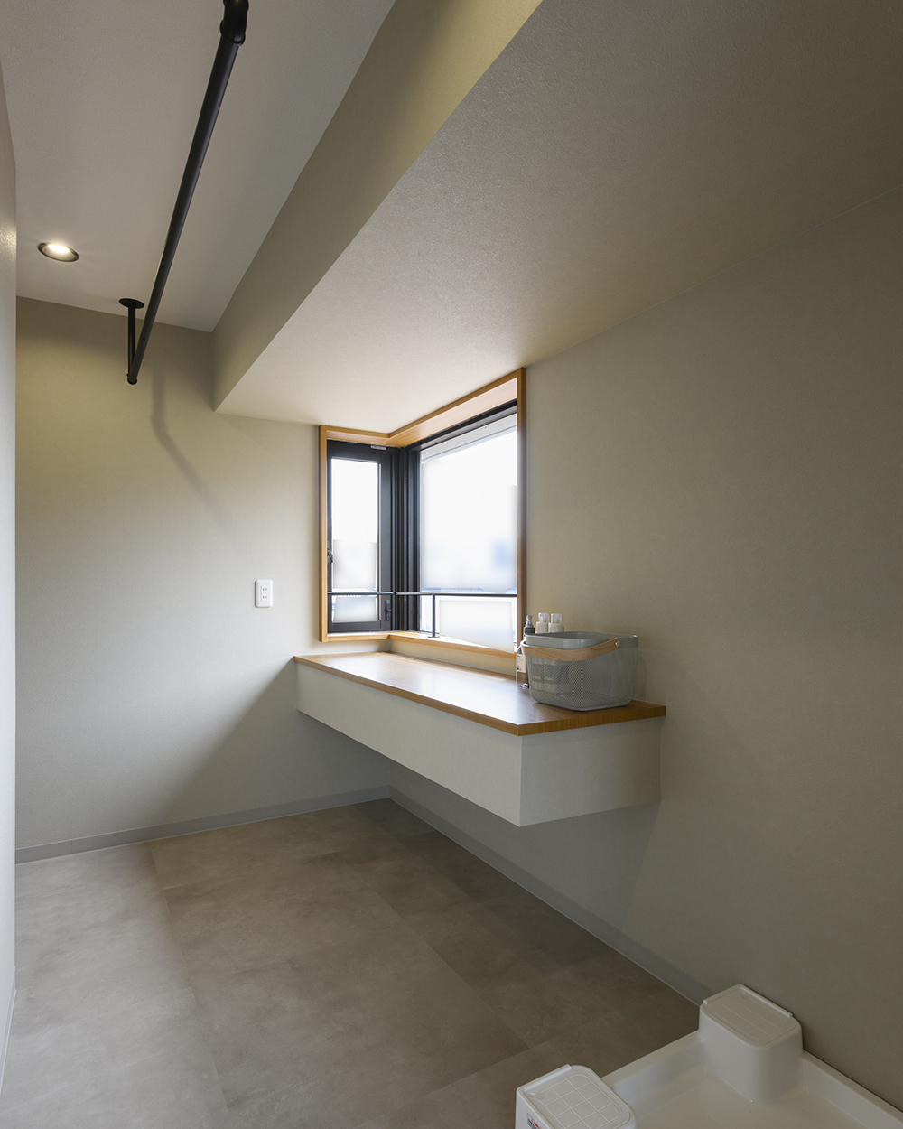 洗濯物を干してすぐにたためる実用的な洗面脱衣所は広々としています。