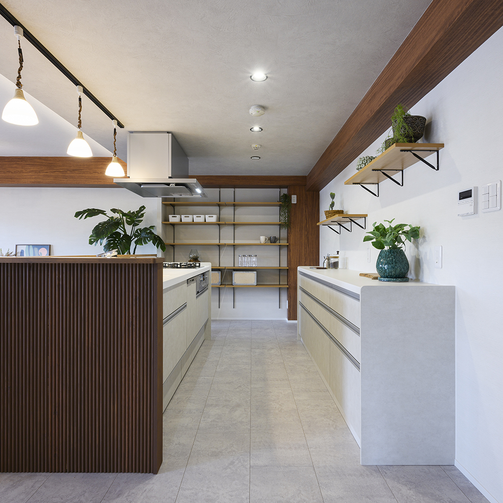 アイランドキッチンの後ろにはカウンター。壁の収納にもこだわっています。
