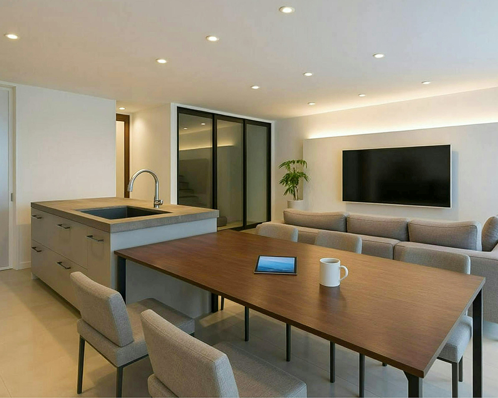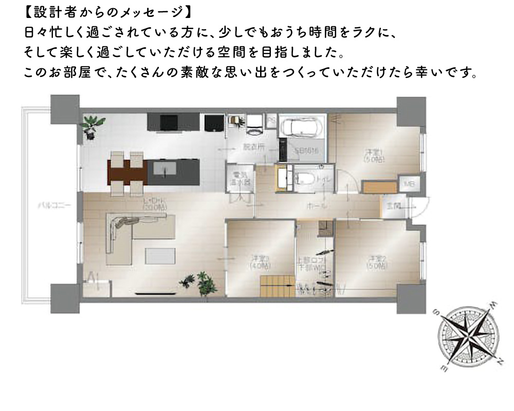 キッチンを中心とした部屋は家事の負担も少なく、家族が集まって楽しく、くつろげます