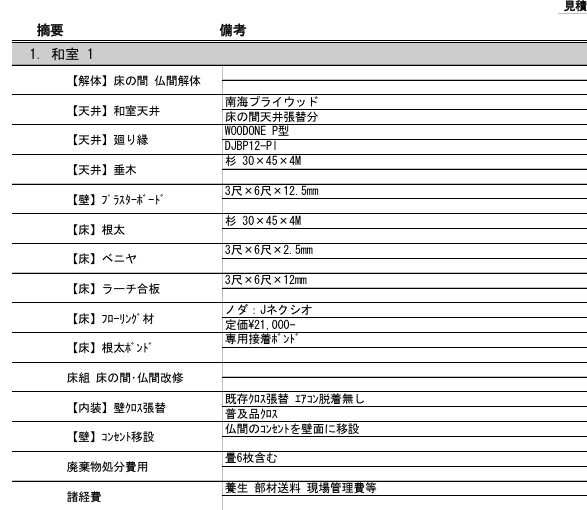 1. 工事の項目と数量は「部屋ごと・工程ごと」に記載されているか?(例:「リビング内装工事一式」ではなく、「天井:クロス張替え 〇〇㎡」のように具体的か)
