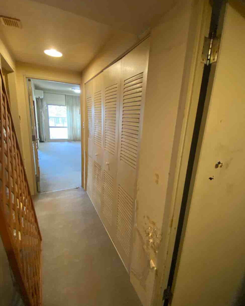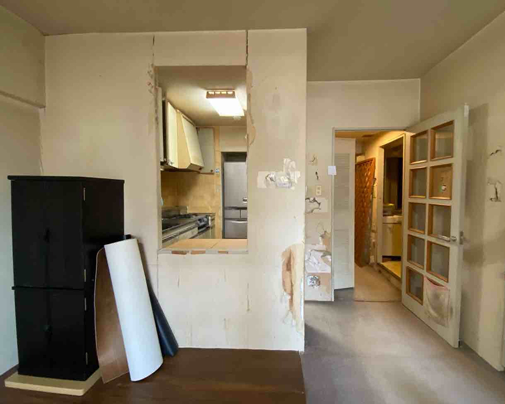壁の剥がれや汚れが気になる、工事前の廊下。