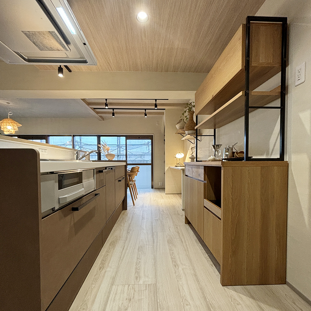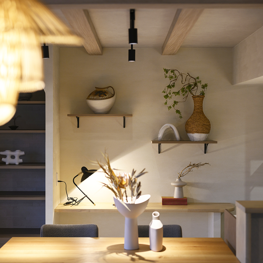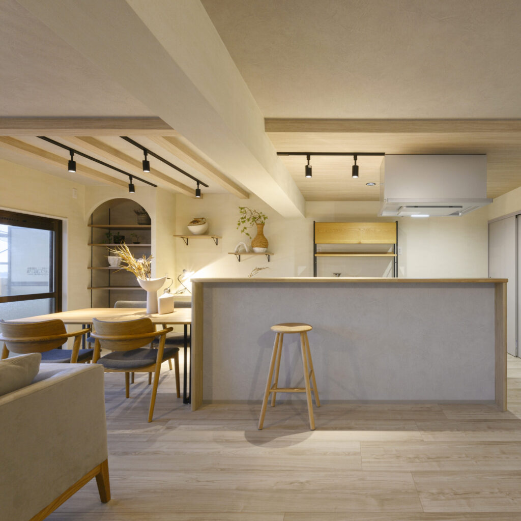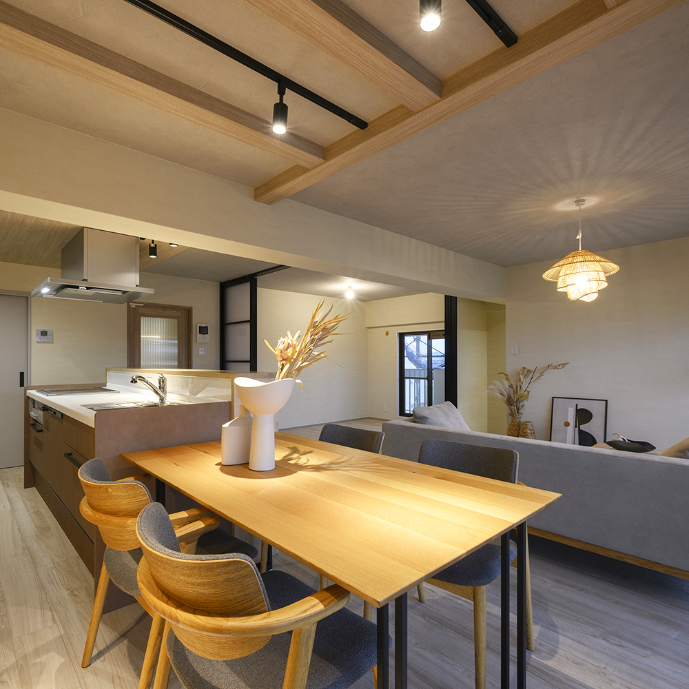 天井の造作化粧梁で木目の温かみを演出し、くすみカラーで統一したジャパンディテイストに。マンションながら戸建てのような空間性を実現しています。