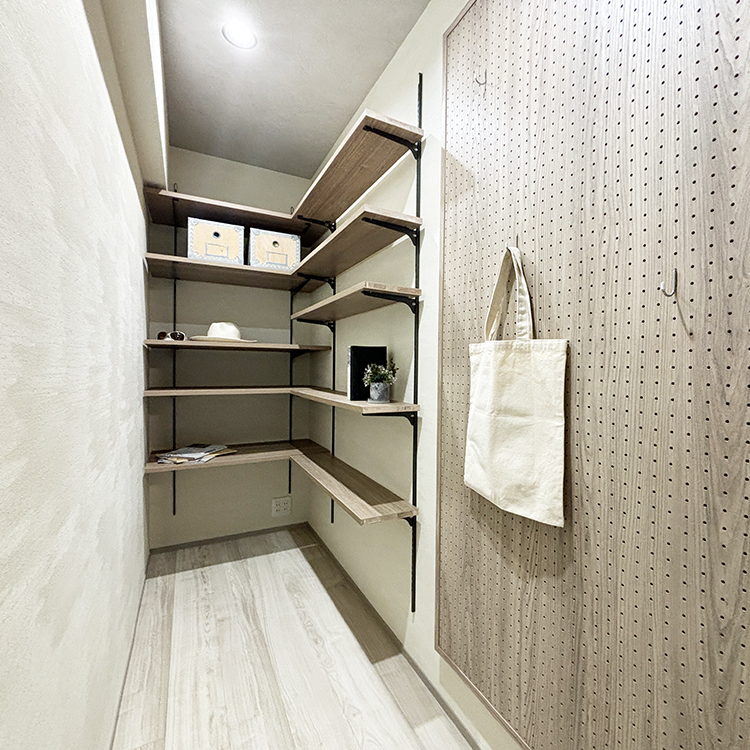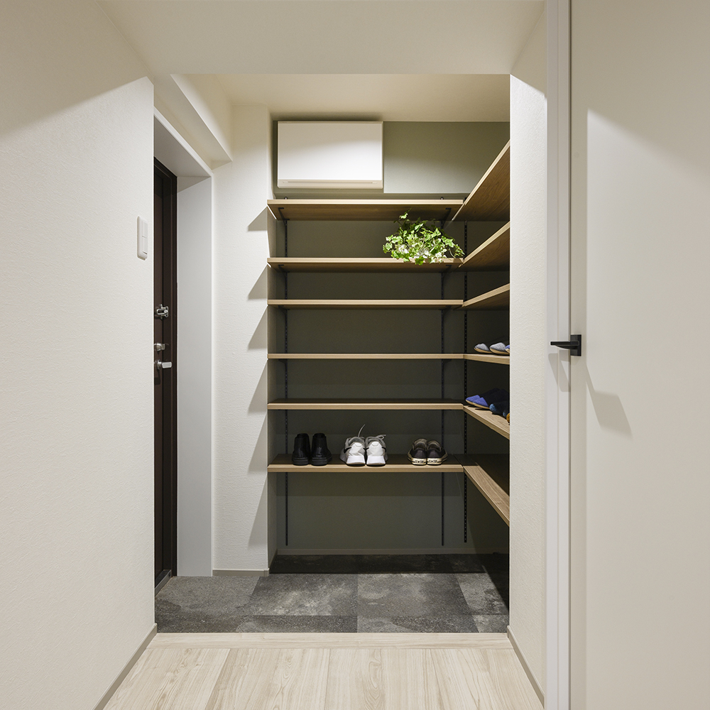 玄関の壁一面の棚は可動式なので、収納するものに合わせて自由自在。ショップのように飾って収納するとテンションが上がります。