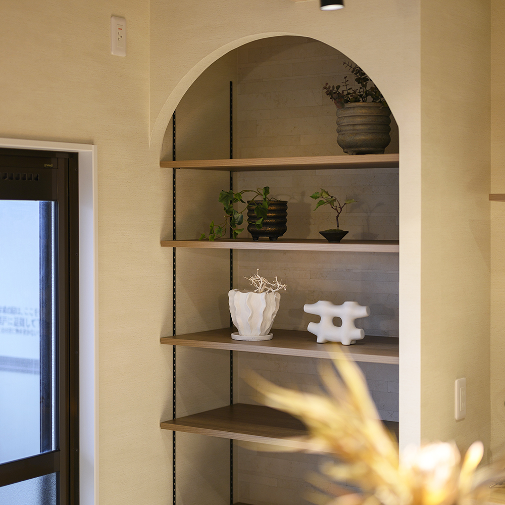 キッチン背面にある家事をしながらPC作業もできるカウンターやおしゃれなカーブを描いたニッチ(壁面収納)は、お気に入りのポイント。お風呂・洗面所も拡張し、家事や育児のストレスを軽減できる住まいを目指しました。 (担当:永尾 霞)