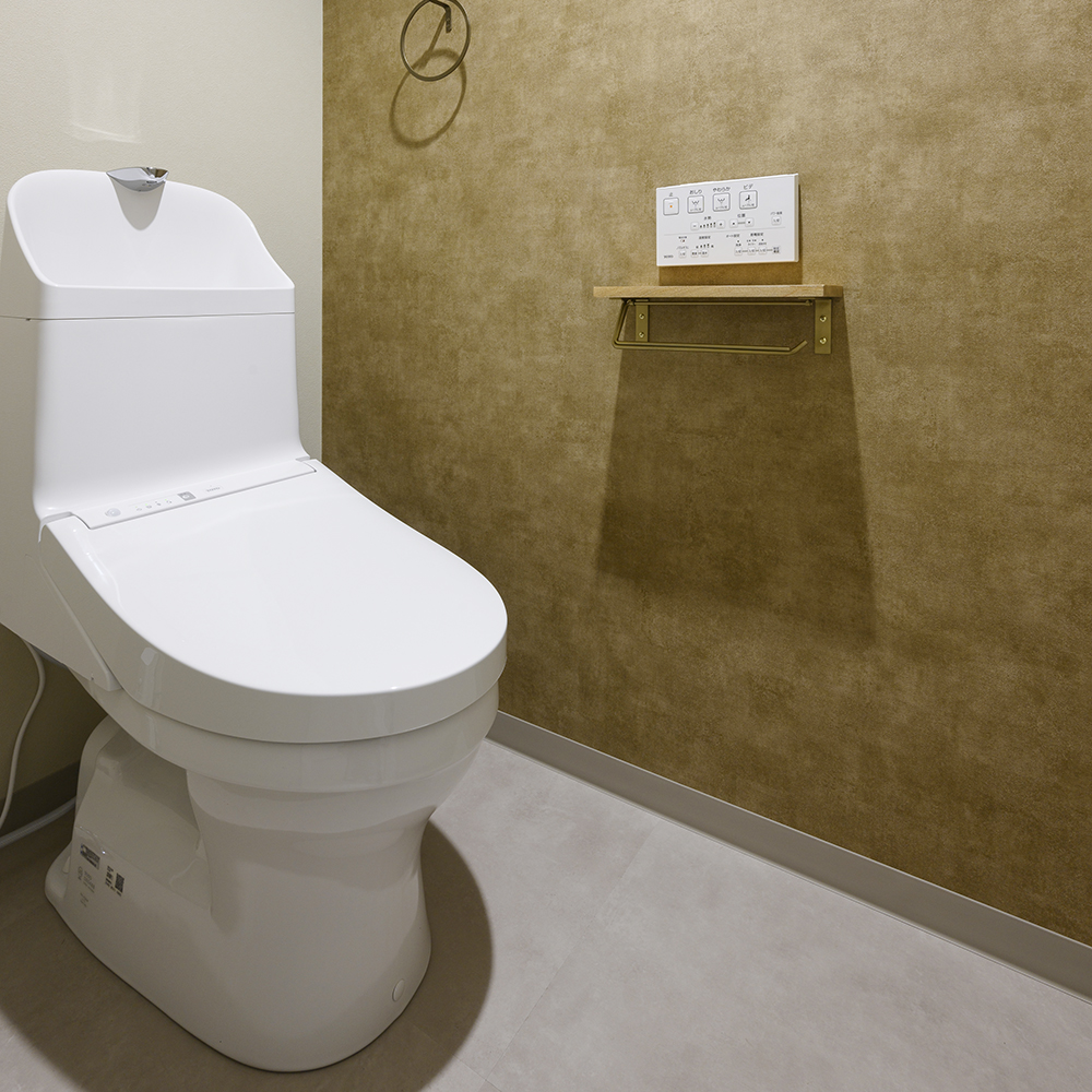 アクセントクロスは塗り壁風のマットなブラウン系、丸いタオルホルダーもポイントにシックな空間に仕上がりました。