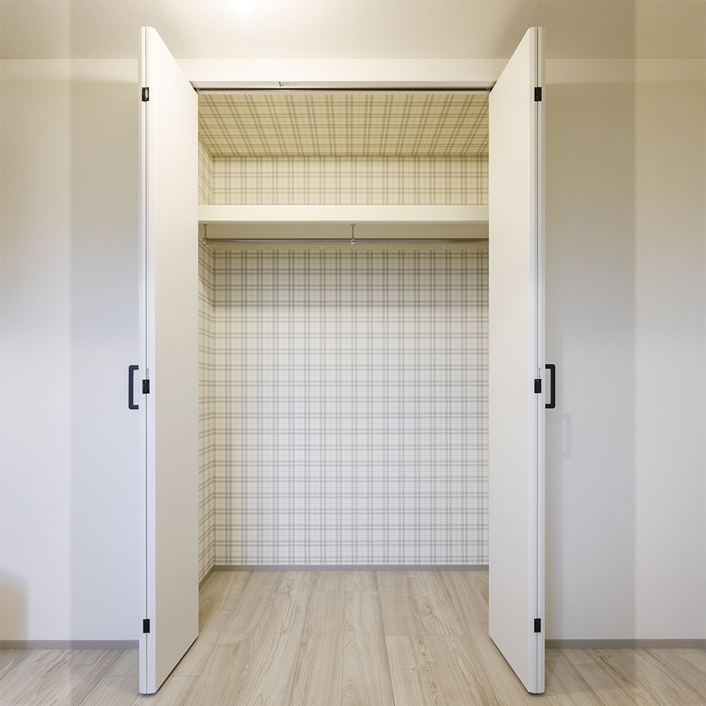 間仕切り戸を開けば広い一体空間となり、ご夫婦がくつろぎながらお子様を見守れる環境に。LDK周辺に個室や収納を配置し、日常生活を完結できる機能性を追求しました。