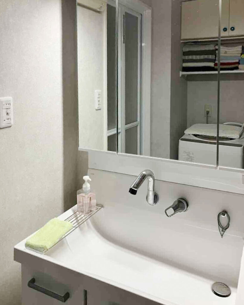 洗面台はLIXIL:ピアラ 洗面ボウルが広く、縁も少ないため、汚れがたまりにくく掃除が楽です。